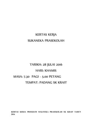 Up to 3 cash back kertas program sukaneka prasekolah by cecilia4linsua. KERTAS KERJA CADANGAN AKTIVITI SUKANEKA Kelab Bola Sepak Kelab Sepak Taktaw 28 Julai 2010 Disediakan oleh. 23 JULAI 2016 HARI.